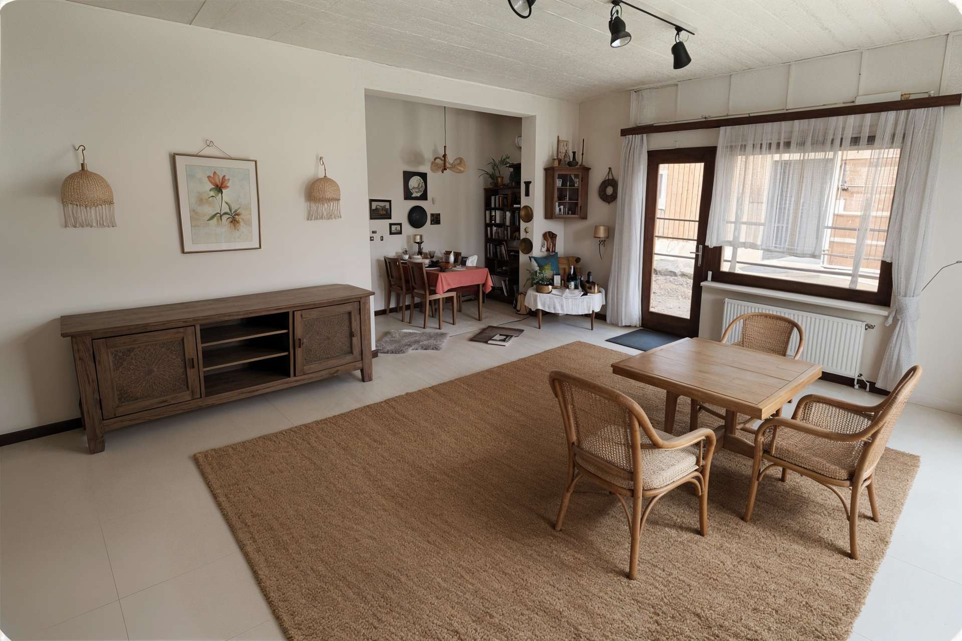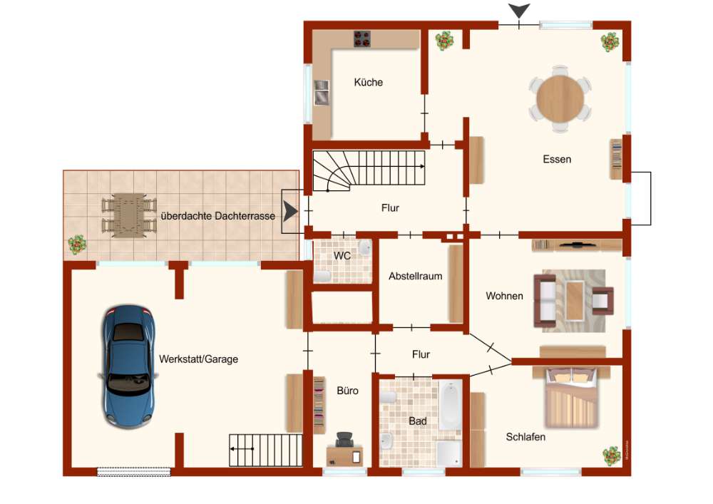 Das Erdgeschoss überzeugt mit einem direkten Zugang zur Werkstatt, einer geräumigen Garage und einer überdachten Terrasse, die Ihnen einen privaten und komfortablen Wohnbereich im Freien bietet. Hier genießen Sie Ruhe und Flexibilität in Ihrem eigenen Zuhause.