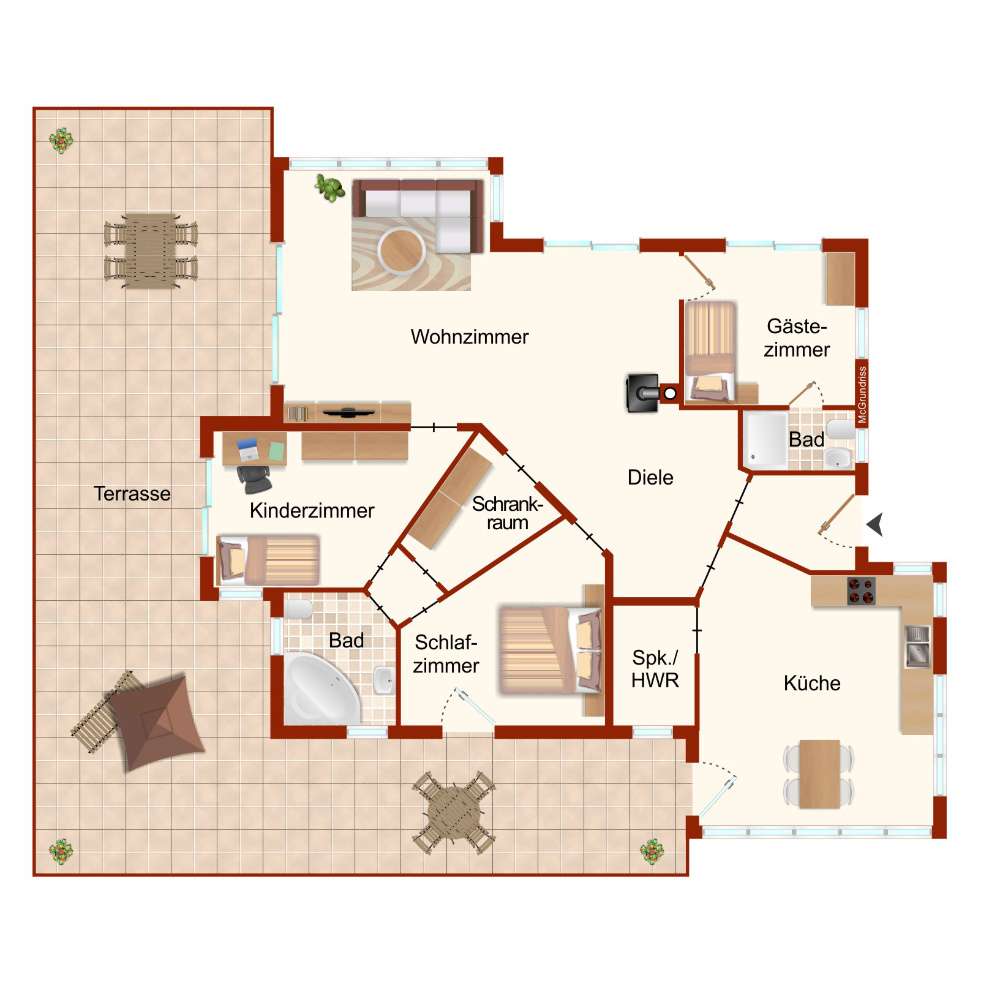 Die umlaufende Terrasse ermöglicht vielfältige Nutzungsmöglichkeiten im Freien, ob zum Entspannen, Spielen oder für gesellige Grillabende. Die Südterrasse ist teilweise überdacht und mit einer Markise versehen.