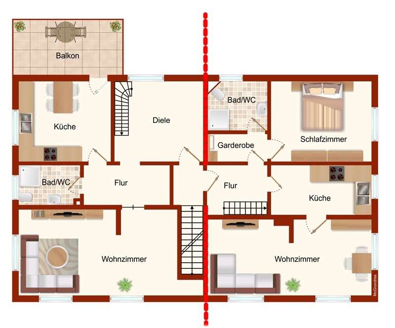 Über den Eingangsflur und das Treppenhaus gelangen Sie zu den beiden Maisonettewohnungen. Die größere Wohnung bietet Ihnen ca. 138 m² Wohnfläche, aufgeteilt in fünf Zimmer und zwei Bäder. Im Obergeschoss betreten Sie die Wohnung über die ansprechende Wohndiele, von der eine Treppe ins Dachgeschoss führt.