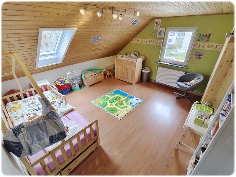 Im Dachgeschoss befinden sich das Schlafzimmer, zwei Kinderzimmer sowie ein Arbeits- und Gästezimmer. Ein großzügiges Bad mit Badewanne, Dusche und Sauna rundet das Raumangebot ab.