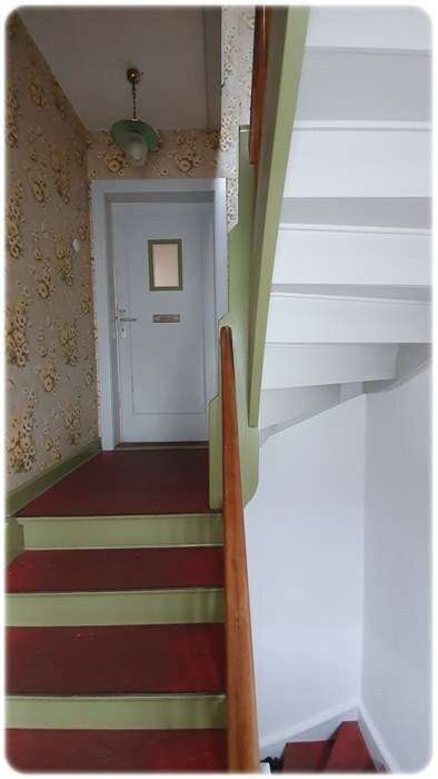 Im 1. Obergeschoss befindet sich eine 2-3-Zimmerwohnung mit Küche und Badezimmer. Diese Räumlichkeiten bieten dank einer durchgehenden Deckenhöhe (keine Dachschrägen) maximalen Raumkomfort und Stauraum. Die Elektrik wurde hier 1997 teilerneuert. Die Wohnung wird derzeit mit Strom-Nachtspeicheröfen beheizt, benötigt jedoch eine umfassende Modernisierung.