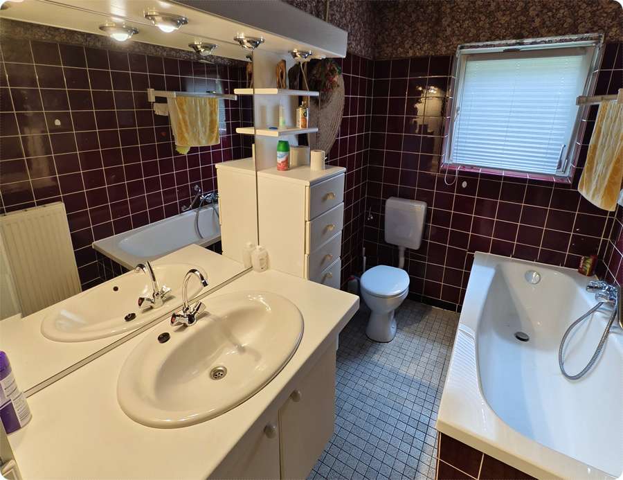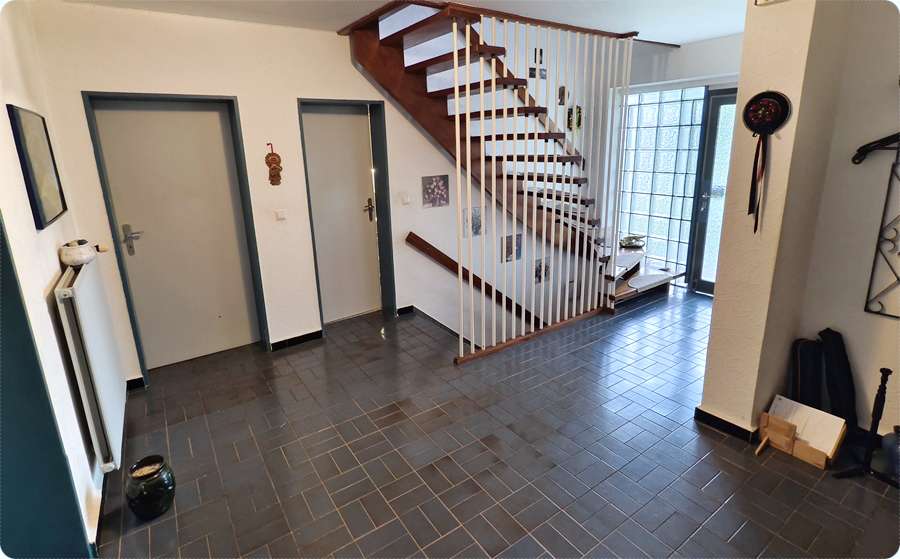 Für den täglichen Komfort stehen Ihnen zwei Bäder zur Verfügung: Ein modernes Duschbad, sowie ein gepflegtes Wannenbad, das zwar noch etwas Sanierungsbedarf aufweist, aber mit etwas Liebe schnell wieder in neuem Glanz erstrahlen kann. Eine großzügige Diele verbindet alle Räume miteinander und schafft einen offenen, freundlichen Empfangsbereich. Von hier aus gelangen Sie bequem über die Treppe ins Obergeschoss und in den voll ausgebauten Keller.