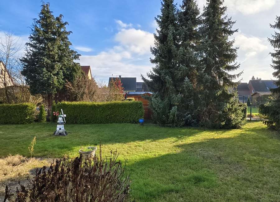 Ihr grünes Wohnzimmer: Der idyllische Garten ist bereit für Rutsche, Sandkasten und Grillfeste. Dank des eigenen Gartenbrunnens bleibt der Rasen auch in heißen Sommern grün, ohne dass die Wasserrechnung explodiert.