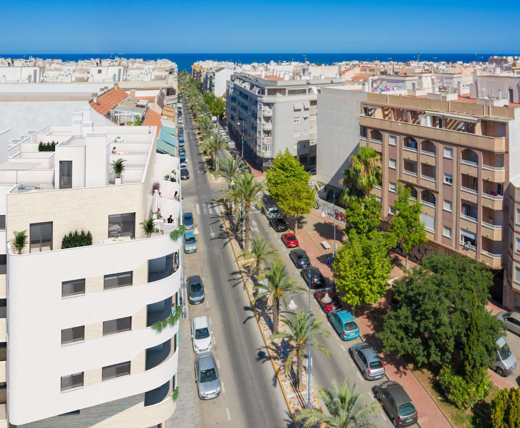Der exklusive Wohnkomplex befindet sich an einer der Hauptstraßen im Zentrum von Torrevieja und besticht durch seine herausragende Lage. Nur ca. 300 Meter trennen die Anlage von den besten Stränden der Stadt, sodass Bewohner und Besucher die mediterrane Küste bequem zu Fuß erreichen können. Die unmittelbare Nähe zu einer Vielzahl wichtiger Dienstleistungen macht das Wohnen hier besonders komfortabel: Restaurants, Cafés und Supermärkte sind fußläufig erreichbar und bieten eine breite Auswahl an kulinarischen und alltäglichen Angeboten.