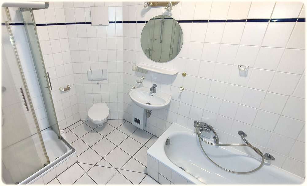 Das Badezimmer ist hell und großzügig gestaltet und verfügt über eine Badewanne, eine Dusche, eine Toilette und ein Waschbecken. Diese Ausstattung sorgt für einen hohen Komfort und ermöglicht Ihnen einen entspannten Start in den Tag oder einen entspannenden Ausklang am Abend.