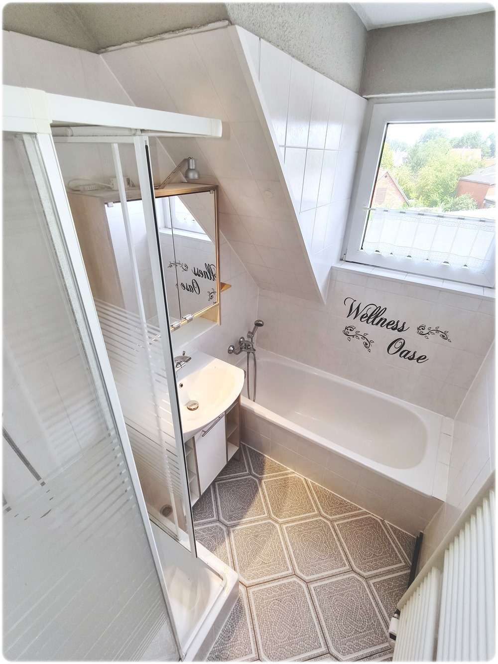 Im Obergeschoss des Hauptgebäudes erwartet Sie eine weitere 3-Zimmerwohnung (ca. 79 m² Wfl.) mit einer einladenden Küche und einem sonnigen Balkon. Ein weiteres Tageslicht-Duschbad und eine separate Toilette bieten höchsten Komfort.