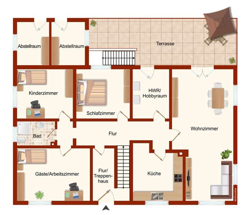 Die großzügige Erdgeschosswohnung erstreckt sich über ca. 126 m² und verfügt über vier individuell nutzbare Zimmer. Ergänzt wird das Angebot durch einen Hobby- und Hauswirtschaftsraum, ein modernes Tageslicht-Duschbad und eine geräumige Küche. Alle Räume sind über einen zentralen Flur zugänglich. Vom Wohnzimmer sowie dem Hauswirtschaftsraum haben Sie direkten Zugang zur ca. 37 m² großen Terrasse und dem Garten, die ideal für gesellige BBQ-Abende sind.