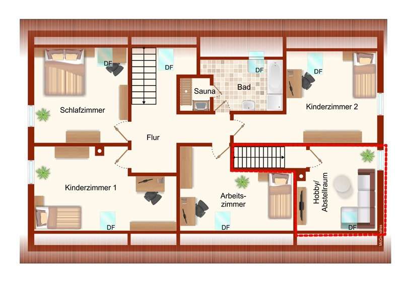 Im Dachgeschoss befinden sich das Schlafzimmer, zwei Kinderzimmer sowie ein Arbeits- und Gästezimmer. Ein großzügiges Bad mit Badewanne, Dusche und Sauna rundet das Raumangebot ab.