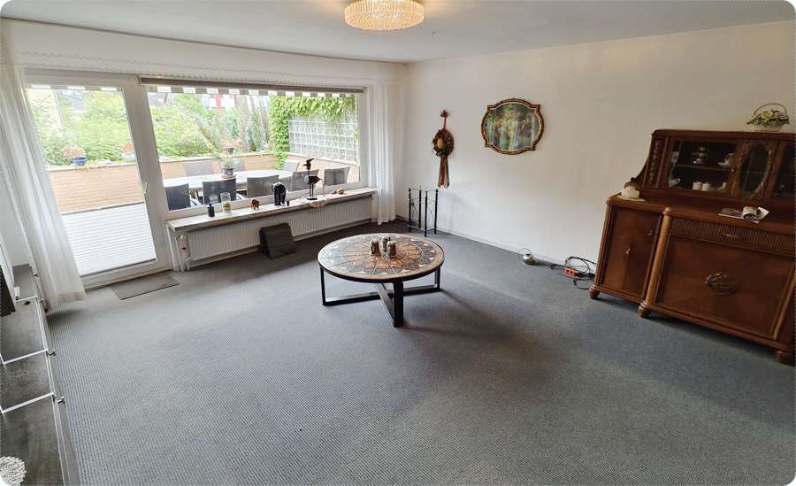 Vom Wohnzimmer gelangen Sie auf die großzügige Südterrasse, welche mit einer Sonnenmarkise ausgestattet ist.