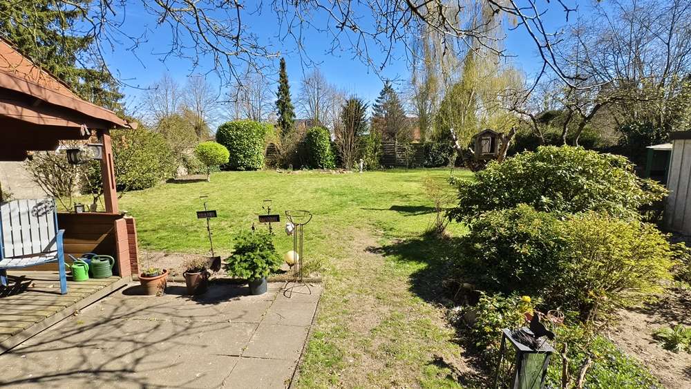 Der großzügige Garten mit praktischem großen Gartenhaus, bietet viel Platz für Erholung, Spiel und kreative Gartengestaltung.